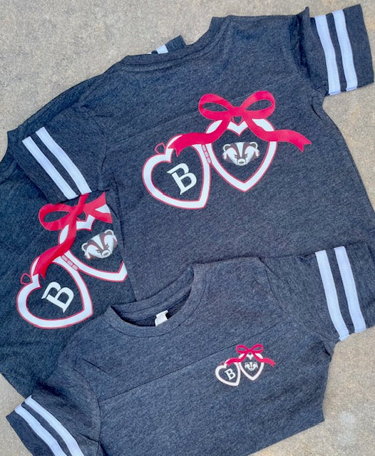 Show off your playful side with the Badger Locket tee. Your choice of sporty stripe sleeves or solid color you will be sure to look trendy. This locket tee combines sporty vibes with a touch of adorable charm. Perfect for casual days or game day fun, it’s a stylish way to keep your look fresh and fun.