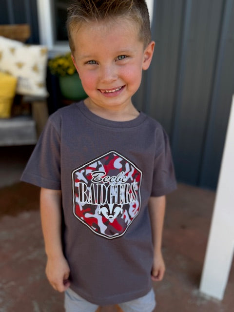 Add a splash of fun with the Colorful Camo Badger tee, available in your choice of bold red or cool blue. Printed on a soft ash grey or charcoal grey Bella Canvas.