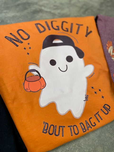 Show off your style with the No Diggity ghost tee, printed using direct-to-film technology for vibrant, lasting colors. This playful shirt adds a fun twist to your wardrobe while keeping you comfy all day. Perfect for Halloween!