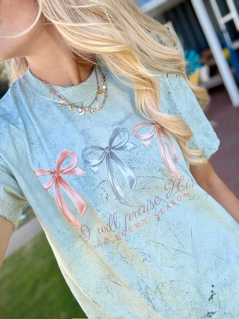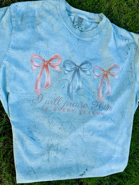 This fern green Comfort Colors Blast tee features expert direct-to-film printing showcasing a delicate watercolor bow alongside the inspiring phrase, “I will praise Him in every season.”